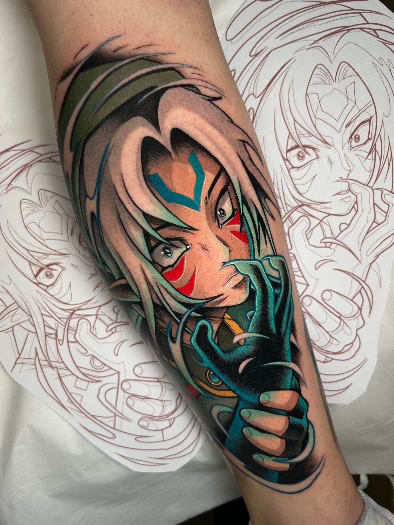 El tatuaje ilustrativo a color mezcla técnicas de dibujo tradicional con una paleta vibrante. Combina líneas definidas con sombreados suaves, creando piezas expresivas, dinámicas y llenas de carácter visual.